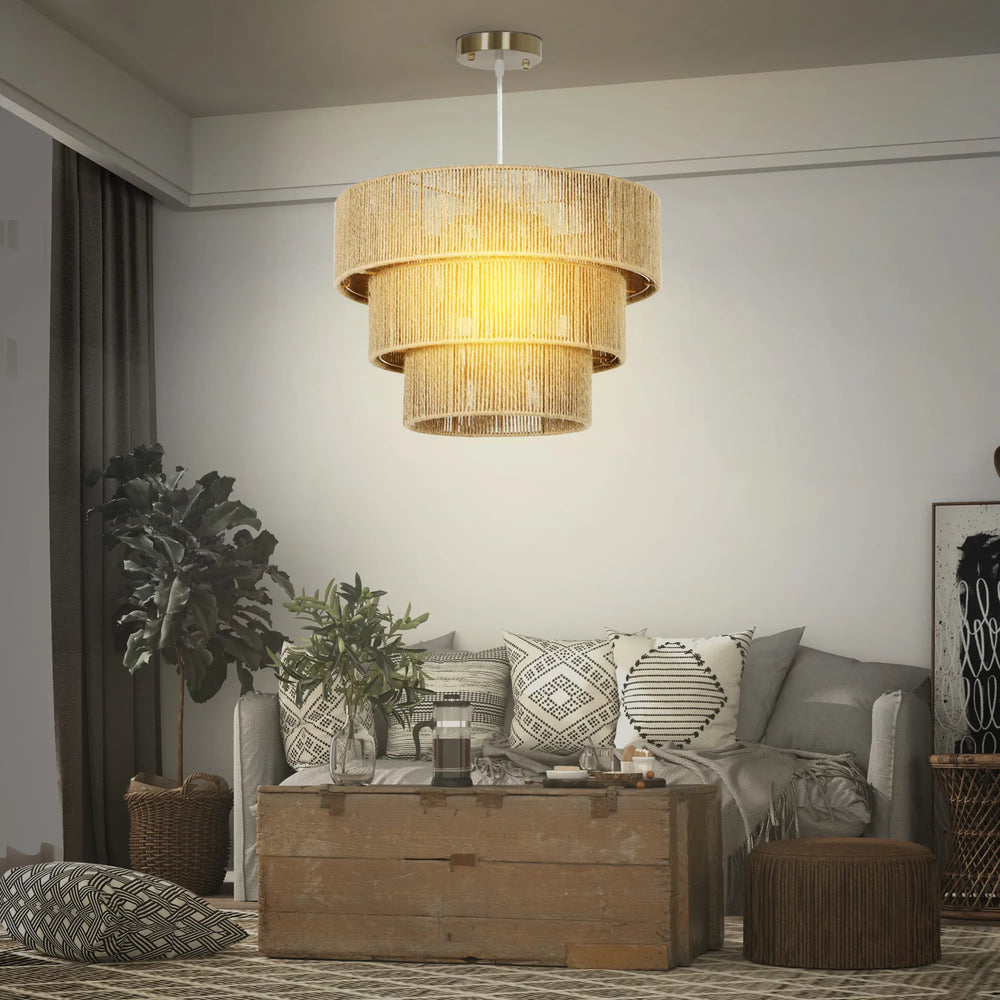 - Bohemian charm: Behold a show-stopping ceiling lamp! Its three-tiered hemp rope lampshade, beautifully cascading in a stepped design with a unique mesh structure, captures light like scattered stardust, infusing any room with irresistible bohemian charm