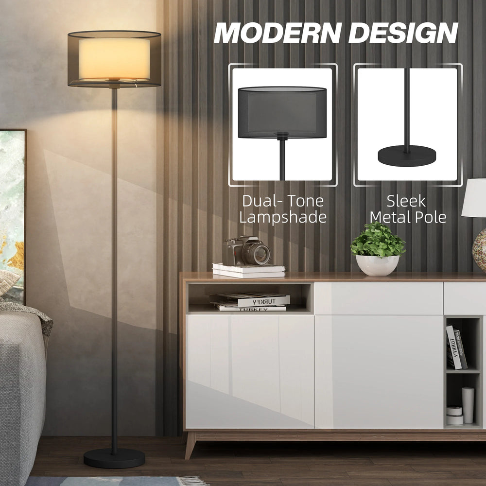 Add a touch of modern elegance to your space with the HOMCOM floor standing lamp. Its chic double lampshade, featuring a sleek black exterior and a crisp white interior, casts a warm, inviting glow. Effortlessly operated by a foot switch, this standard lamp is a stylish and convenient addition to any living room. Suit for both halogen and LED bulbs.