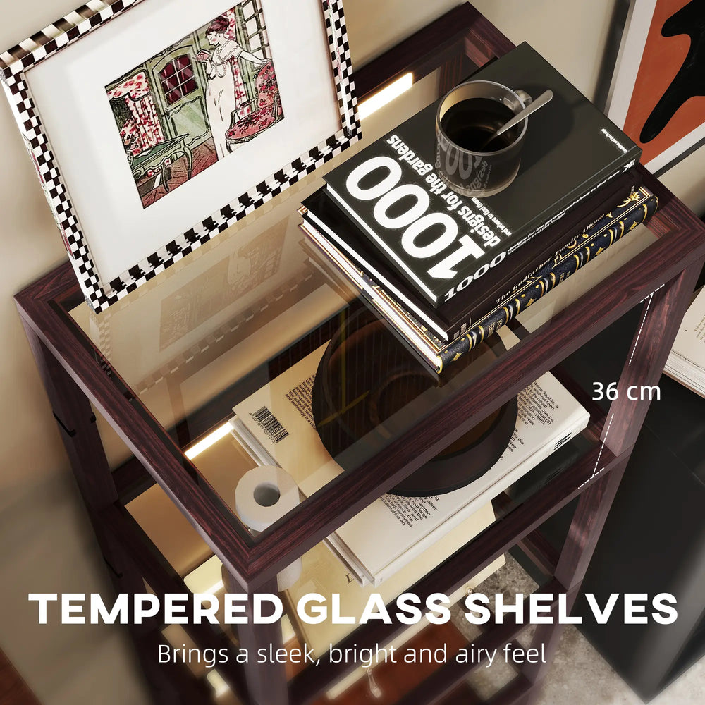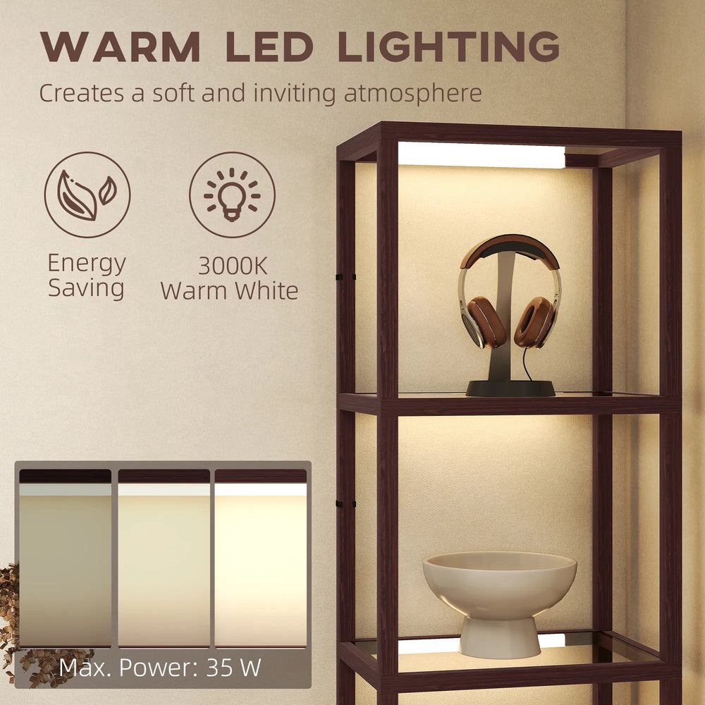 HOMCOM LED Floor Lamp with Glass Shelves, 4 Layers Dimmable Tall Standing Lamp, Modern Column Shelf Floor Light for Living Room, Bedroom, Office, Dark Brown