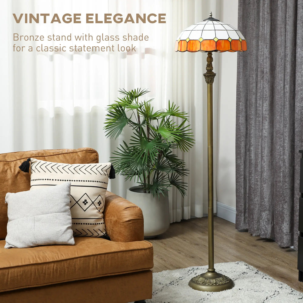 HOMCOM Tiffany-Style Floor Lamp with Handcrafted Stained Glass Shade, 152cm Tall Vintage Standing Lamp with Foot Switch and Dual Sockets for Living Room Bedroom, Bronze Tone and Orange