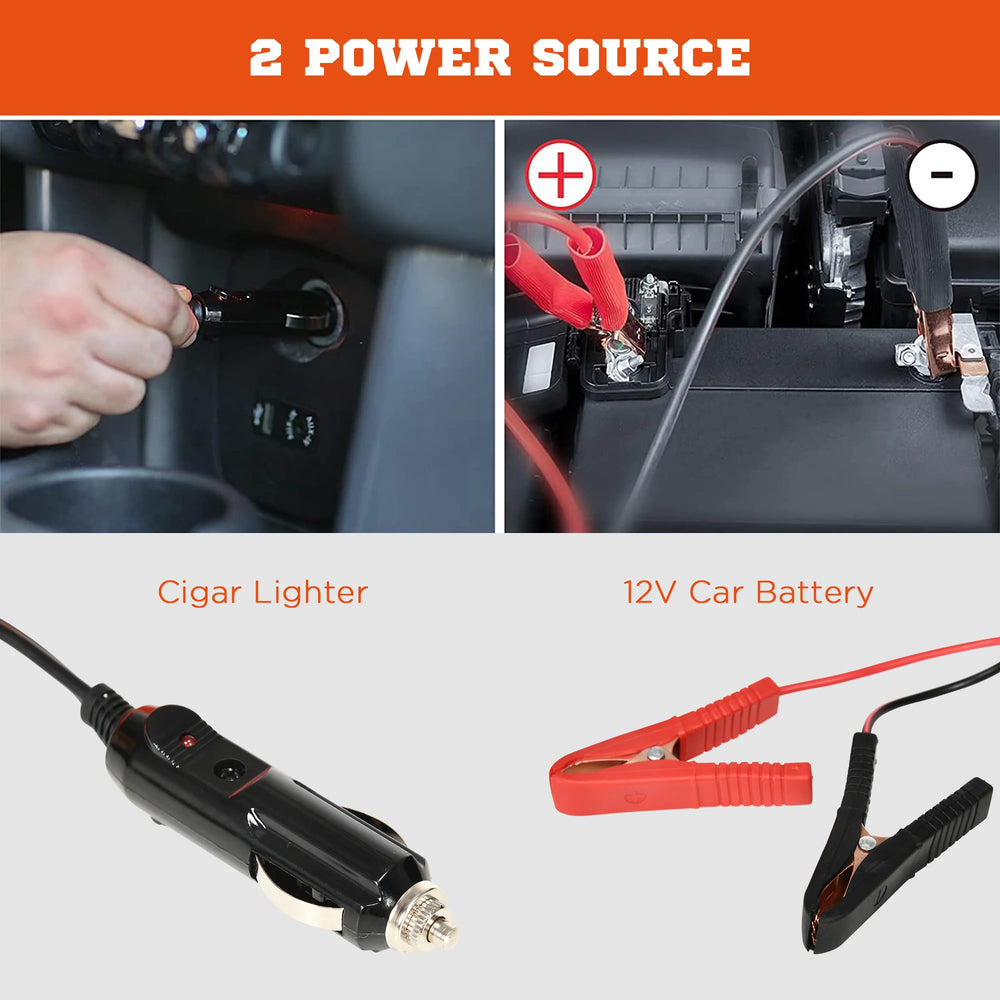 - Convenient power supply: Can be powered with a 12V vehicle socket or cigarette lighter. Perfect if you have an emergency on the motorway, such as a flat tyre.