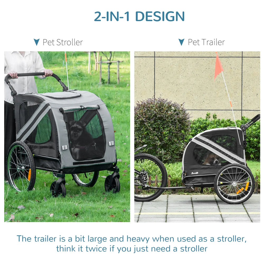 PawHut 2-In-1 Pet Bike Trailer Dog Stroller Pushchair with Universal Wheel Reflector Flag Grey