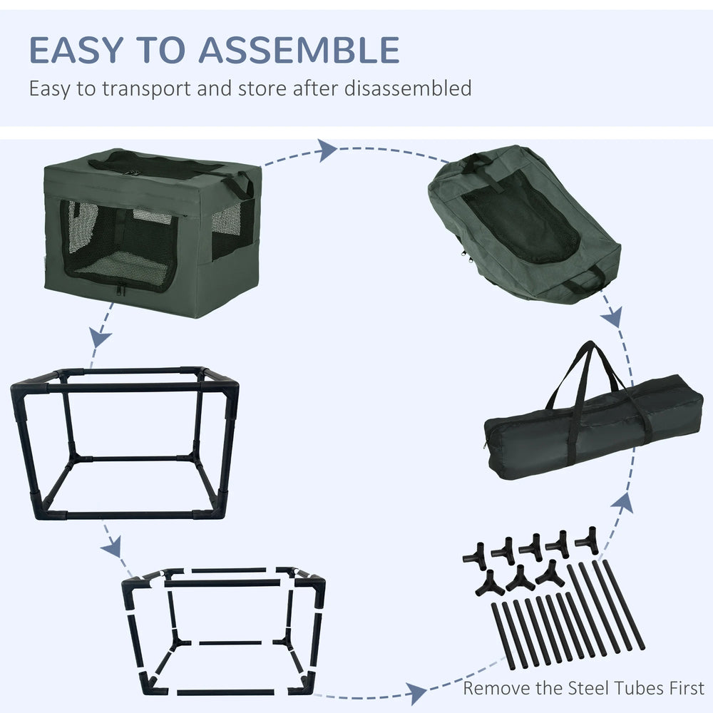 Struggle to travel with pets? With this PawHut fabric dog crate, you'll struggle no more. It has two handles on top, so it's much easier to carry it. Three doors for easy access they'll enter a spacious area, relaxing on a soft cushion whilst the air flows through the mesh window to keep them cool. It's simple to store with the removable tube frame and comes with a bag, saving space. It can also be used at home, so pets have a cosy lounge.