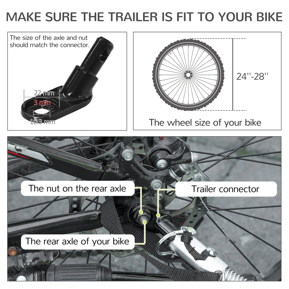 - Dimensions: Trailer: 90H x 170L x 77Wcm. Stroller: 90H x 120L x 77Wcm. Cabin: 63H x 85L x 62Wcm. Off the ground: 25cm. Front door: 67H x 45Wcm. Rear door: 48H x 45Wcm. Cover: 70H x 49Wcm. Side window: 28H x 62Wcm. Rear window: 29H x 45Wcm. Sunroof: 32H x 44Wcm. Pocket: 24.5L x 16Wcm. Safety leash: 55cm. Front wheel: 10". Rear wheel: 20". Suitable bike wheel: 22-26"