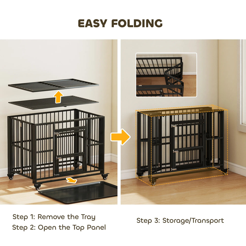 PawHut 43" Heavy Duty Dog Crate, Foldable Dog Cage, with Openable Top, Locks, Removable Tray, Wheels - Black