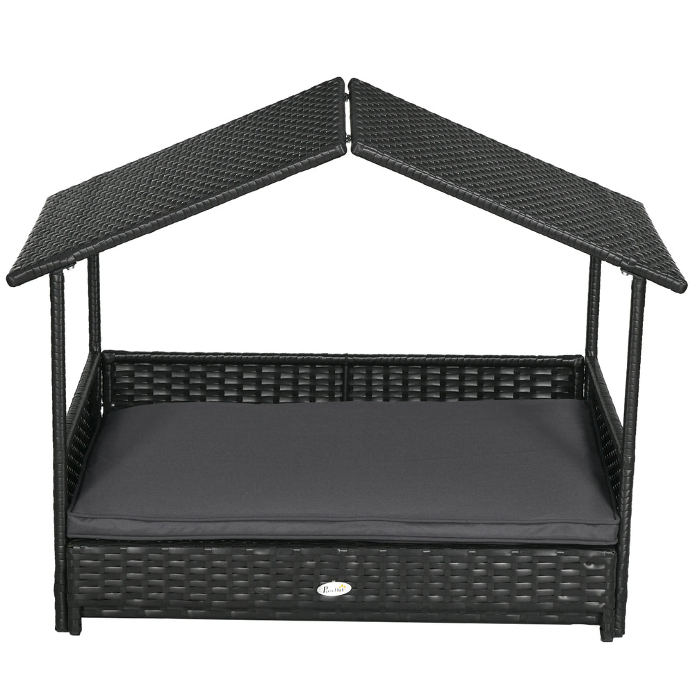 Outdoors, made extra comfortable for pets. This PawHut rattan dog bed offers a spacious resting area, where pets can lay and stretch their body with complete content. Featuring safety railings to keep pets safely on the bed, it also has a protective roof to shade them from the sweltering sun. Plus, its pull-out design at the bottom increases their space - even more room to enjoy. Complete with a cushion and easy-to-clean cover, creating a super snug space for pets to adore.