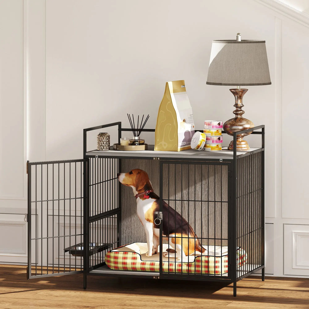 Upgrade your pet's space with the PawHut dog crate furniture that doubles as a sleek side table! Designed to blend seamlessly with your decor, it provides a secure and comfortable space for your furry friend while offering extra storage on top. The 360 rotating bowl holder with two bowls makes feeding effortless and the dual doors with a secure double-lock system ensure added safety. Robust, space-saving and stylish - great for pet owners who want both function and elegance in their home!