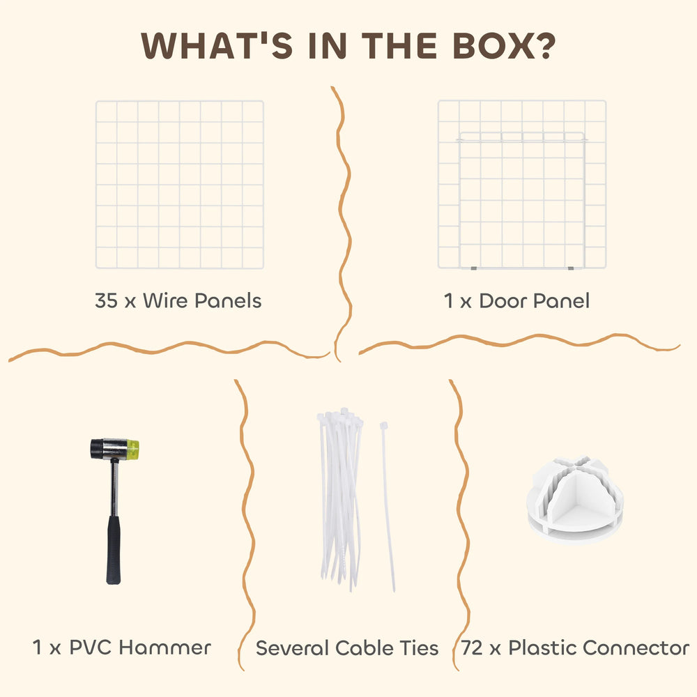 - Set of 36: Free-form panel design allows you to be in control of the size and shape of the c&c cage. Easy to assemble and disassemble, it doesn't have to be a permanent addition to your home.