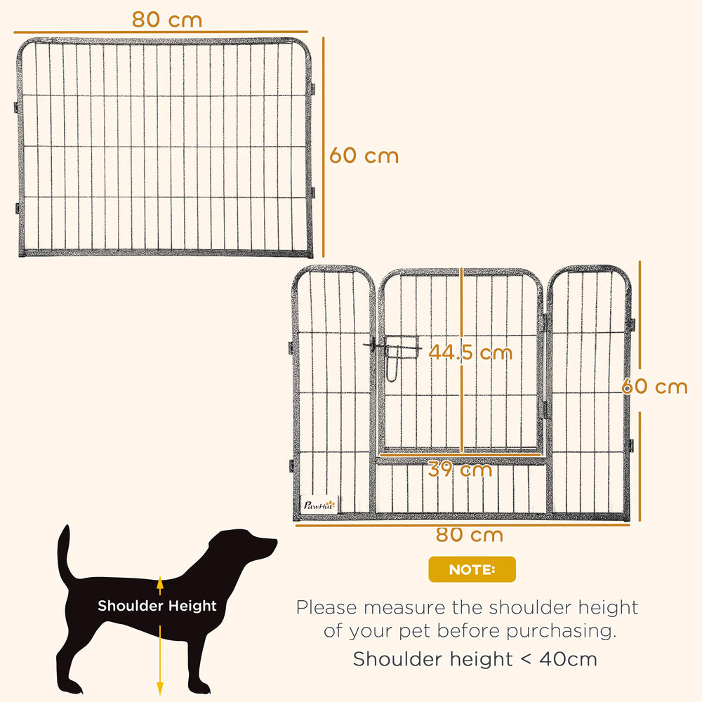 - Dimensions: Each panel: 60H x 80Wcm. Door: 44.5H x 39Wcm. Suitable for small dogs up to 40cm in shoulder height. Easy assembly required.