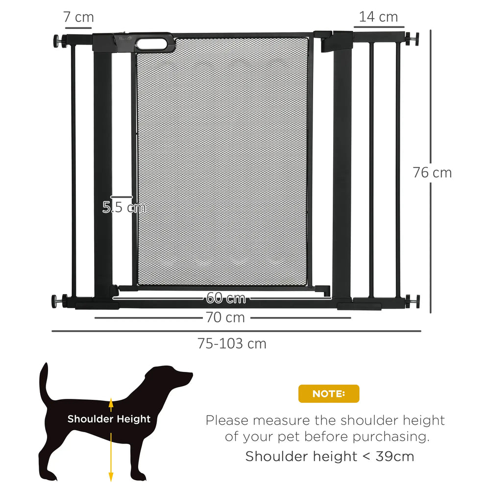 Keep dogs from restricted areas with this PawHut safety gate. Suitable for hallways, doorways and staircases, it has an adjustable width of 75-103cm perfect for different sized openings. This pet gate automatically closes if it's open at less than 90 no more worrying about leaving it slightly open. It's pressure-mounted, making it easy to set up; a safe and effective way to stop pets from going where they shouldn't.