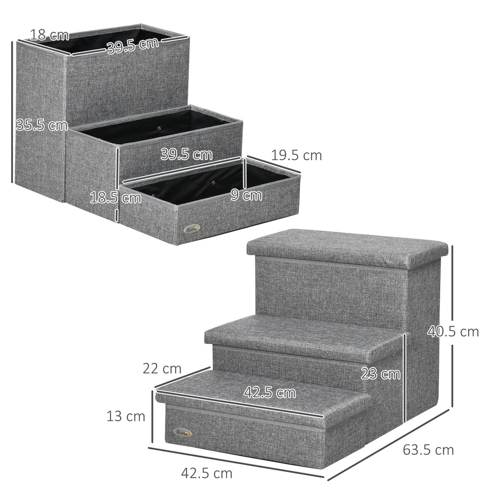 PawHut 3 Steps Pet Stairs, with Storage Boxes, for Bed, Couches - Grey