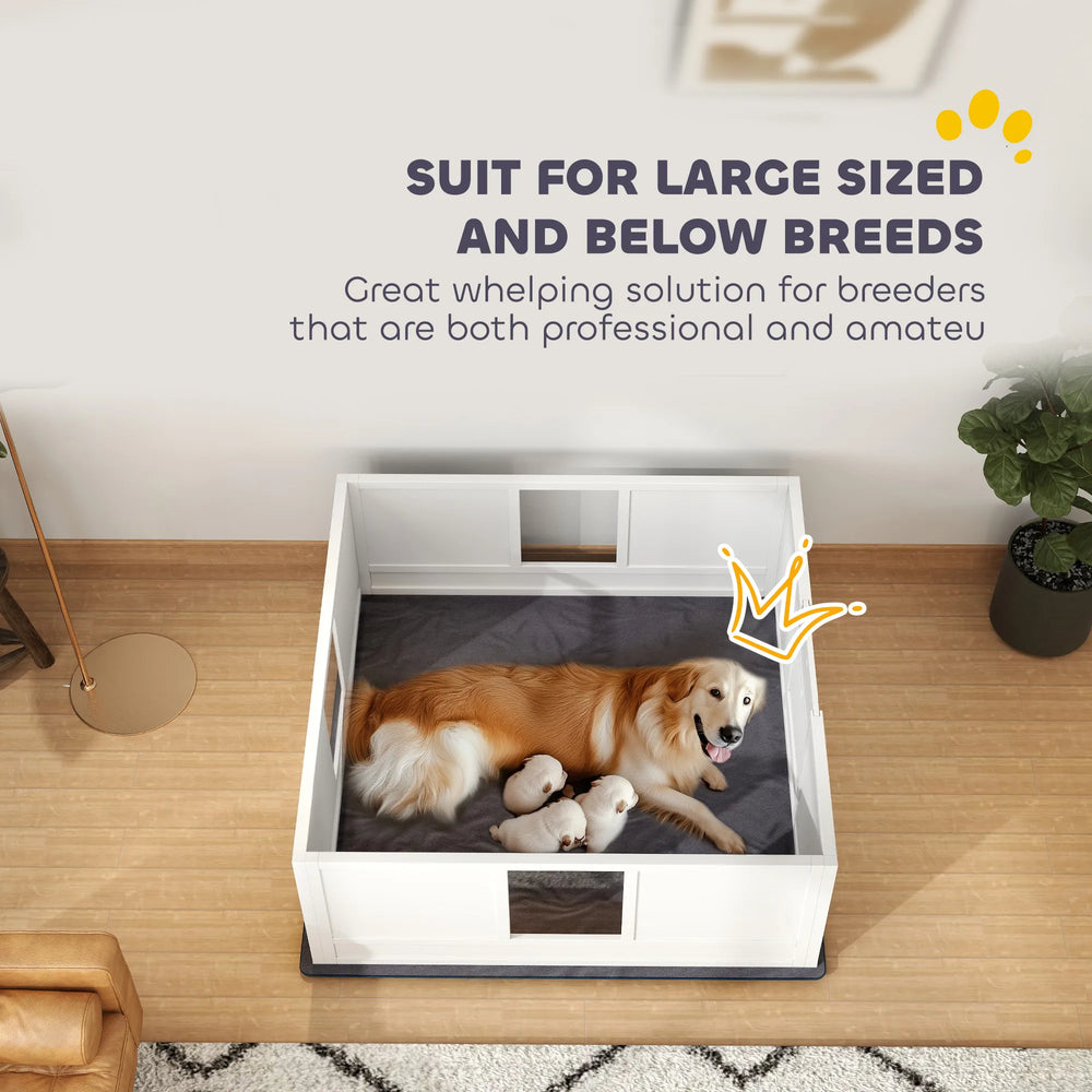 Mother and her pups need comfort, safety and privacy that's what this PawHut dog box provides. Its water-resistant, washable whelping pad makes cleanup effortless, ensuring a hygienic space. With an entrance featuring two removable panels, you can secure puppies while allowing easy access for the mother. Made from pinewood and MDF, it's wind-resistant and stable, while the acrylic windows allow you to watch and interact with your pets.