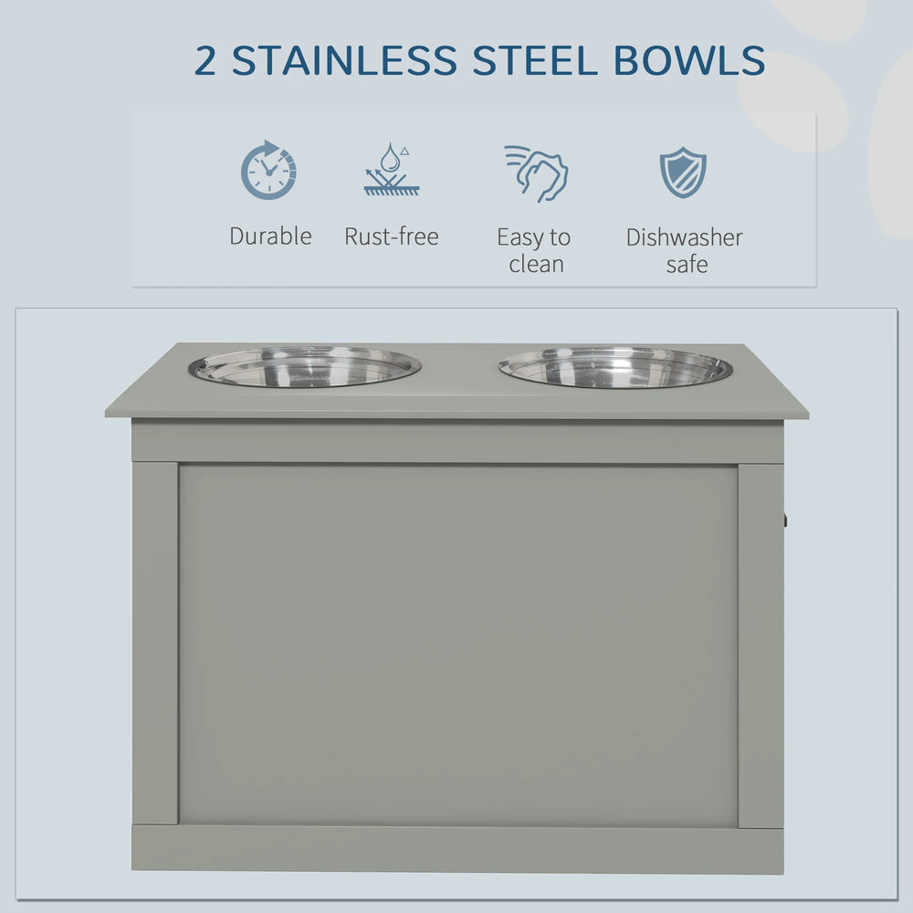 PawHut Raised Dog Bowls, with Storage, Two Stainless Steel Bowls, Elevated Base - Grey