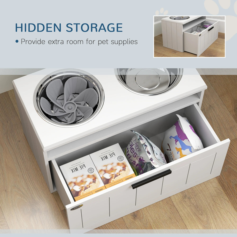PawHut Raised Dog Bowl with Slow Feeder, Two Stainless Steel Dog Bowls, Drawer, for Large and Extra Large Dogs, White
