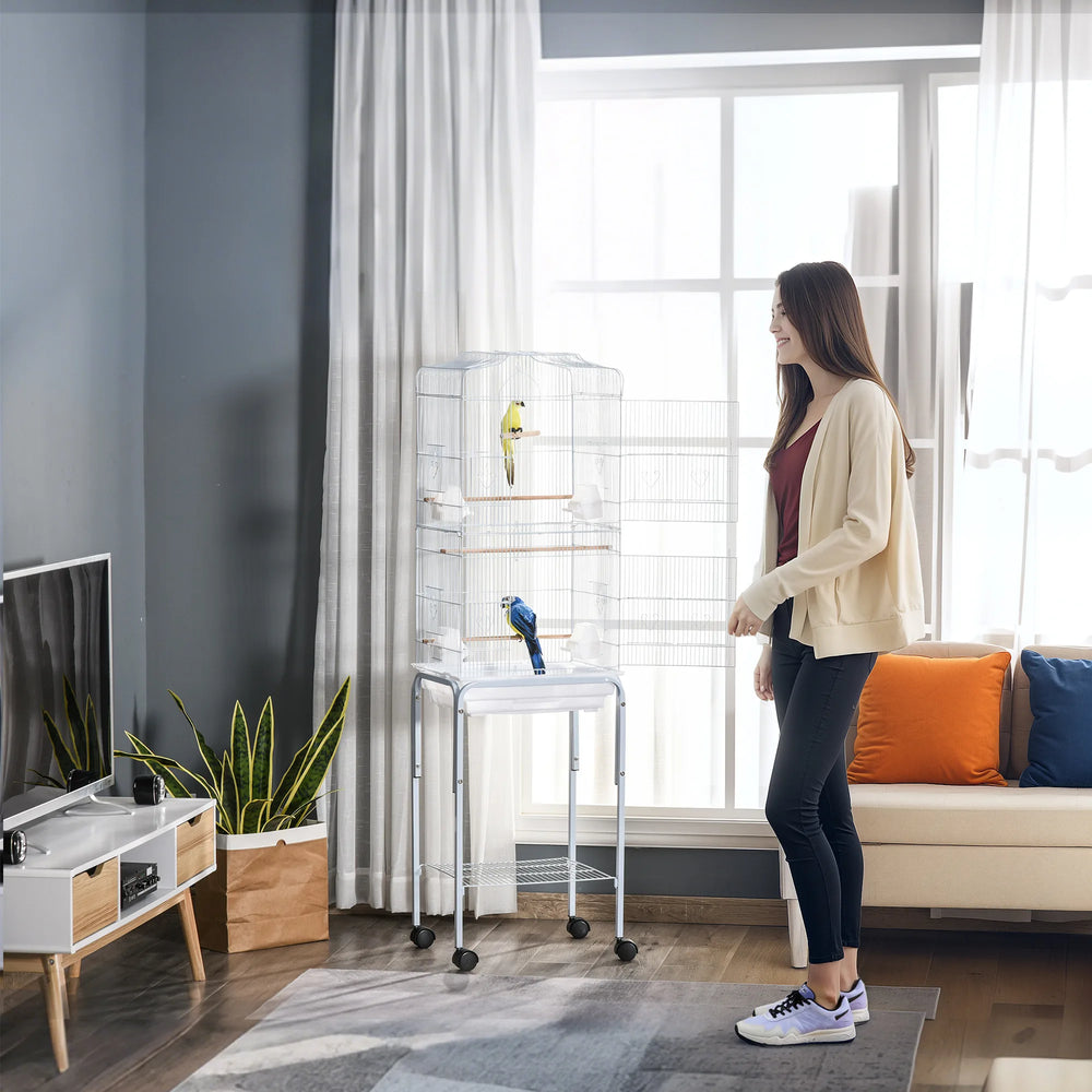 PawHut Bird Cage Budgie Cages for Finch Canary Parakeet with Stand Wheels Slide-out Tray Accessories Storage Shelf, White 46.5 x 36 x 157 cm