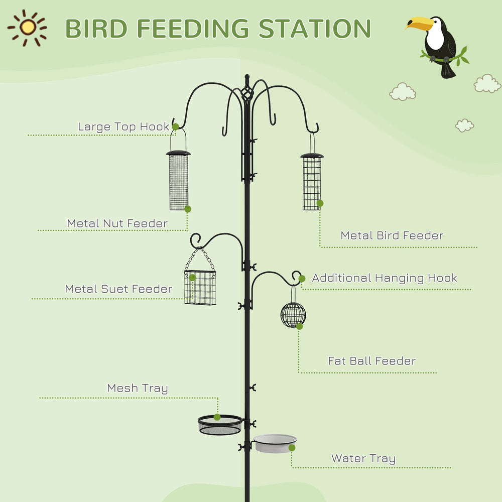Attract a variety of birds by this bird feed station kit from PawHut. Features 6 hooks and 2 trays in total, providing various choices to place feeders. 4 different kinds of feeders are included for you. 4 prong base is stable and durable for reliable daily use. In addition, it's a great gift for parents, children and nature lovers. Put the bird feeding station outside your home near a window or in your patio and make a clear viewing angle to hours of delightful entertainment.
