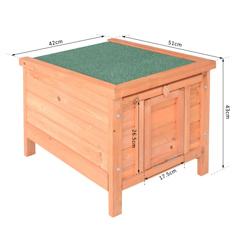 This outdoor pet shelter and rabbit hideaway house from PawHut is the perfect retreat for your furry friend. Made from fully treated and grooved fir wood and designed as a living room for sleeping and playing. The front door opens into a ramp that allows your pets to climb into it easily. The weather-resistant roof is covered in durable composite shingles and will protect your furry friends from adverse weather such as rain, snow, sun, and wind. The raised floor of this house helps keep out insects and other animals and helps avoid trapped moisture. Height adjustable roof opens to the inside for easy cleaning and maintenance. The adjustable arm keeps the roof propped open for climate control.