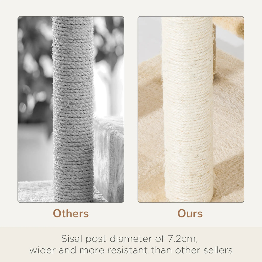 This tall multi level cat scratching tower by PawHut sits nearly 1M tall, ideal for up to three cats with lots of room for play and scratching. It comes complete with a top round perch and three rectangular perches with breathable sisal rope. The bottom posts are also covered with sisal rope for natural scratching instincts, sharpening their claws and saving your furniture. The cat tree for indoor cats is made from particle board and covered with plush soft material, so your cat can feel safe.