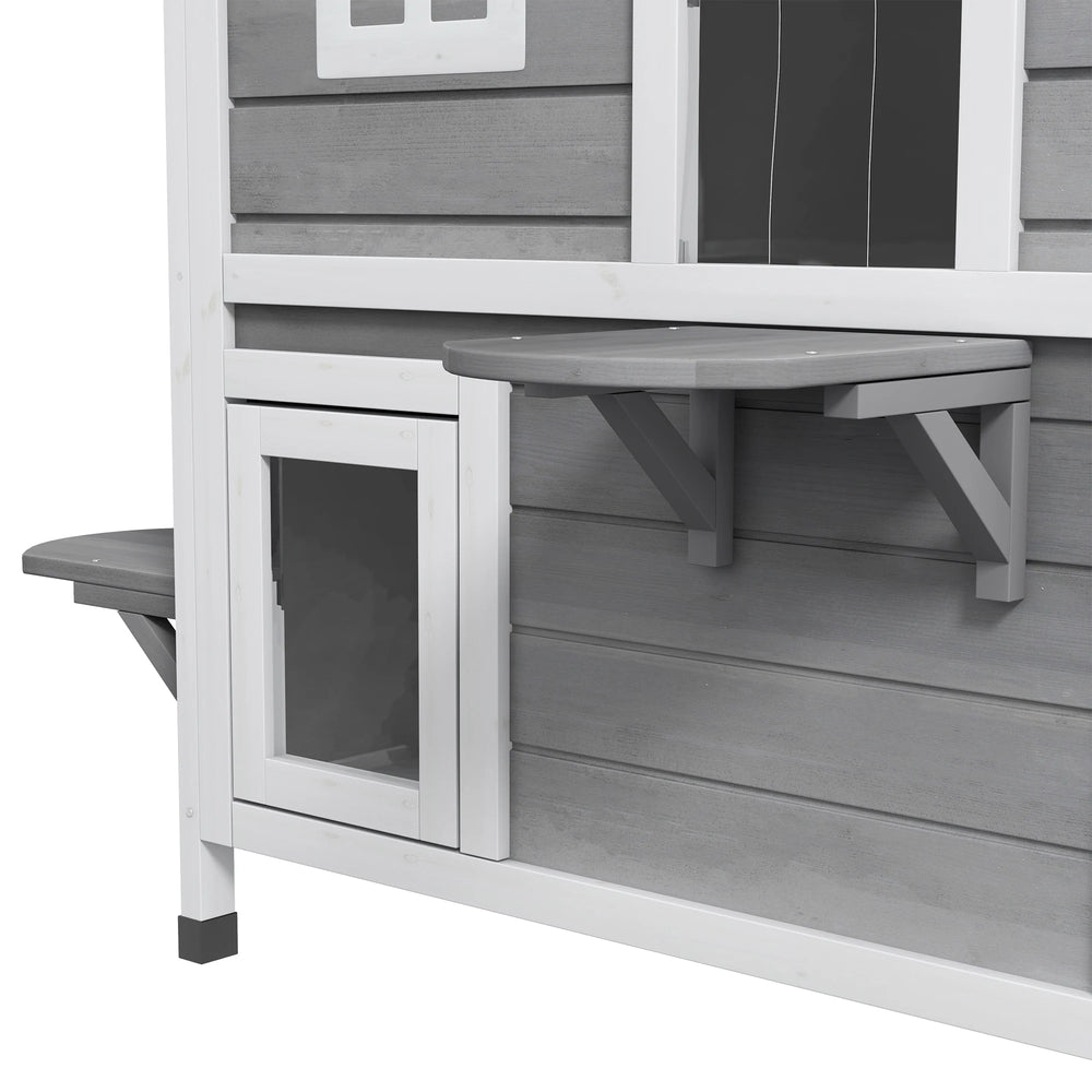 PawHut 2-story Cat House Outdoor, Weatherproof Wooden Cat Enclosure for Feral Cats with Escape Door, Openable Roof, Jumping Platforms, Grey