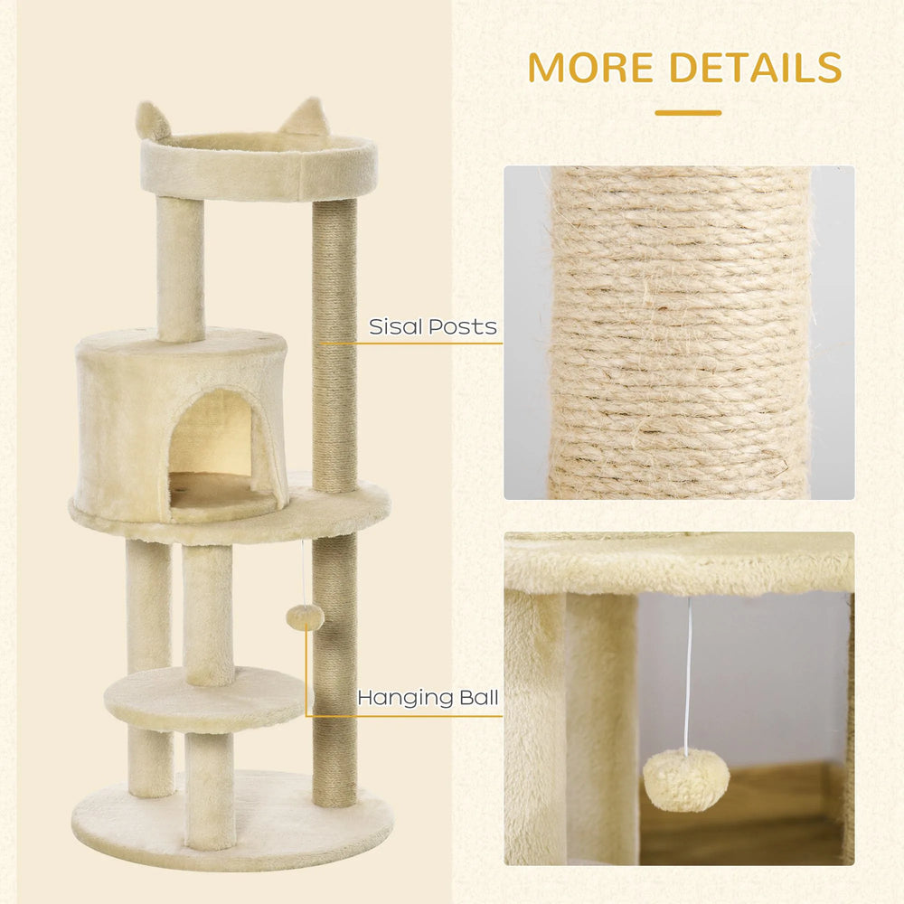 PawHut 104 cm Cat Tree, Cat Condo Tree Tower, Cat Activity Centre with Scratching Posts, Plush Perch, Hanging Ball - Cream White