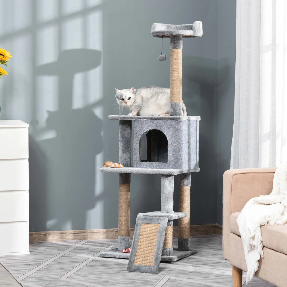 PawHut Cat Tree Tower for Indoor Cats 142cm Climbing Kitten Activity Center with Jute Scratching Post Board Perch Roomy Condo Removable Felt Hanging Toy, Grey