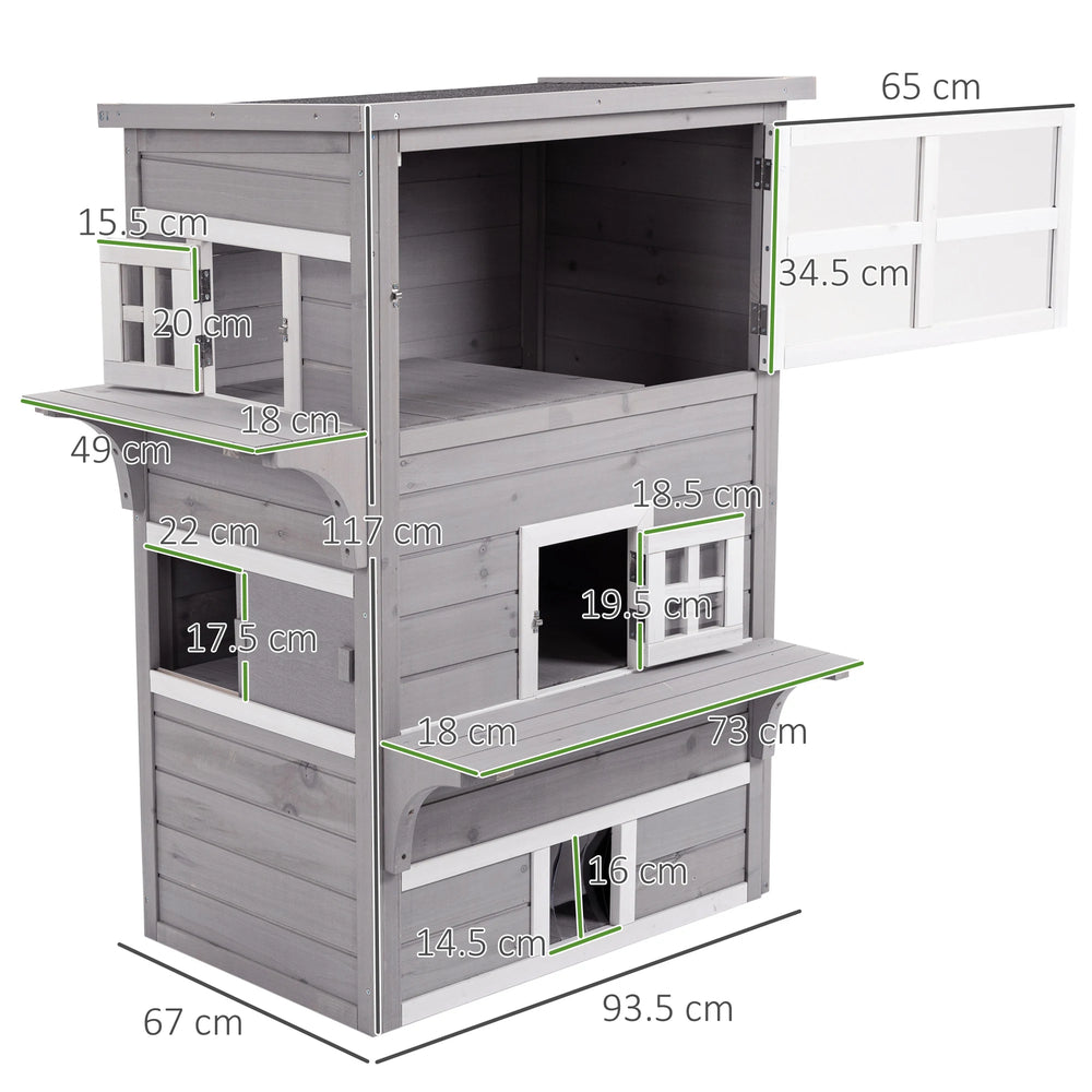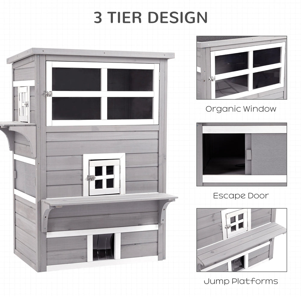 PawHut Three-Tier wooden Kitten Shelter, Outdoor Cat House, with Jumping Platforms, Asphalt Roof, Doors - Grey