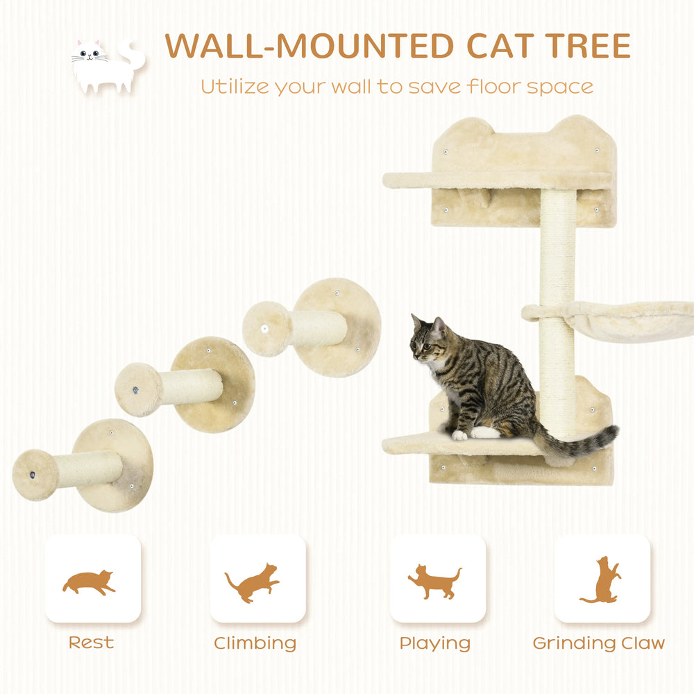 PawHut 4 Piece Cat Shelf with Scratching Post, Wall-Mounted Cat Tree for Indoor Cat - Beige