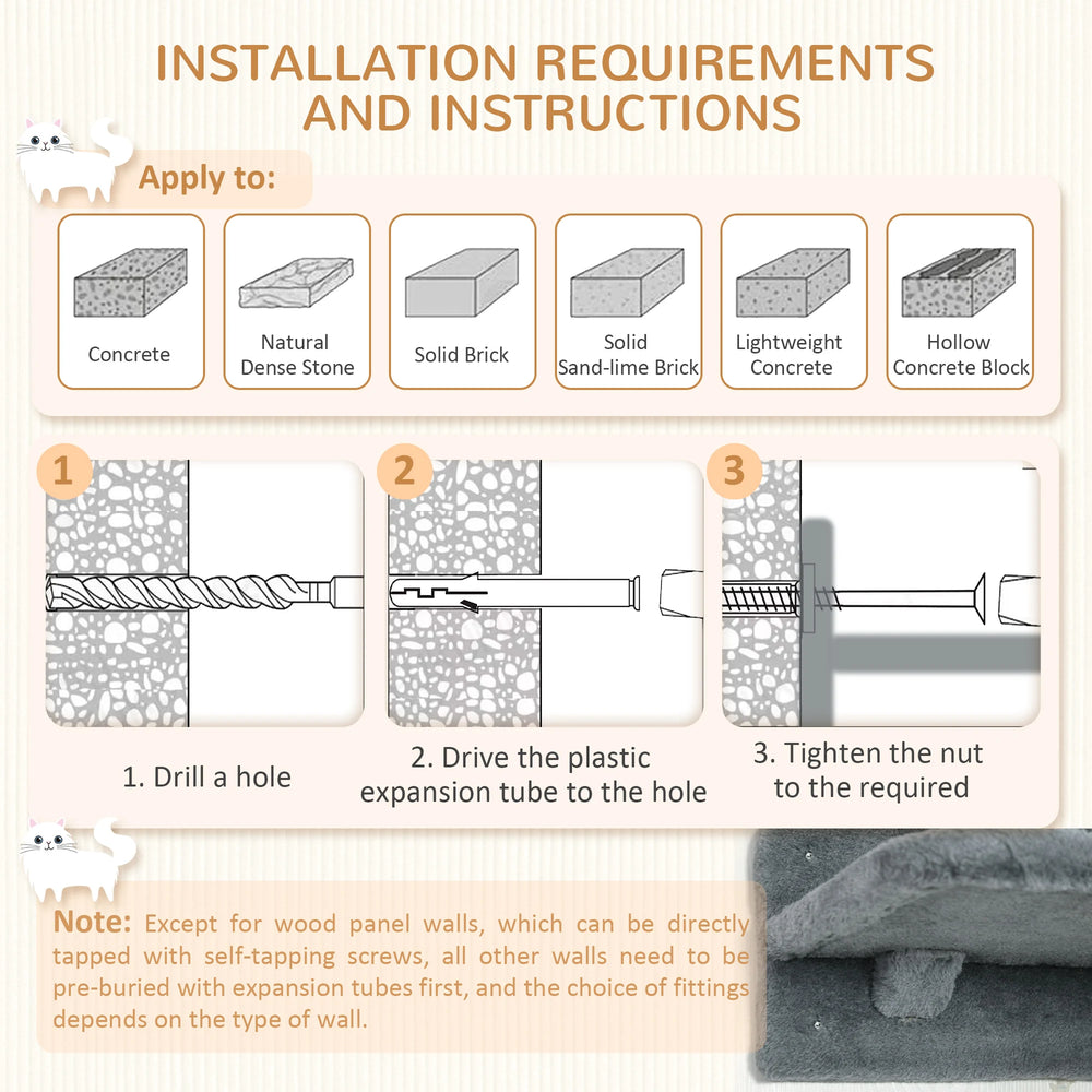 Spark your pet's curiosity with this PawHut cat climbing wall, turning any room into an adventurous and exciting haven. Designed for the wall, it's a comfortable spot for pets to relax and observe it's also a great space saver. There's a hammock for ultimate comfort, whilst the different platforms keep them active when feeling playful. They'll dig their claws into the scratching posts, deterring them from using furniture. Watch your pets revel in joy; a safe space to become their true selves.