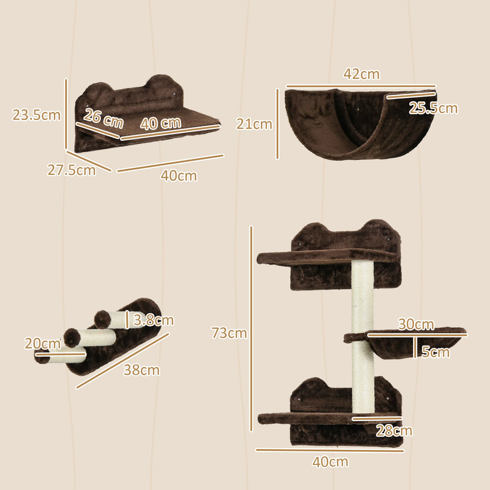 PawHut 4PCs Wall-Mounted Cat Shelves w/ Scratching Post, Hammock, Nest - Brown