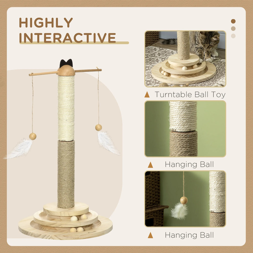 PawHut Cat Tree, with Scratching Post, Turntable Toy Ball - Natural Finish