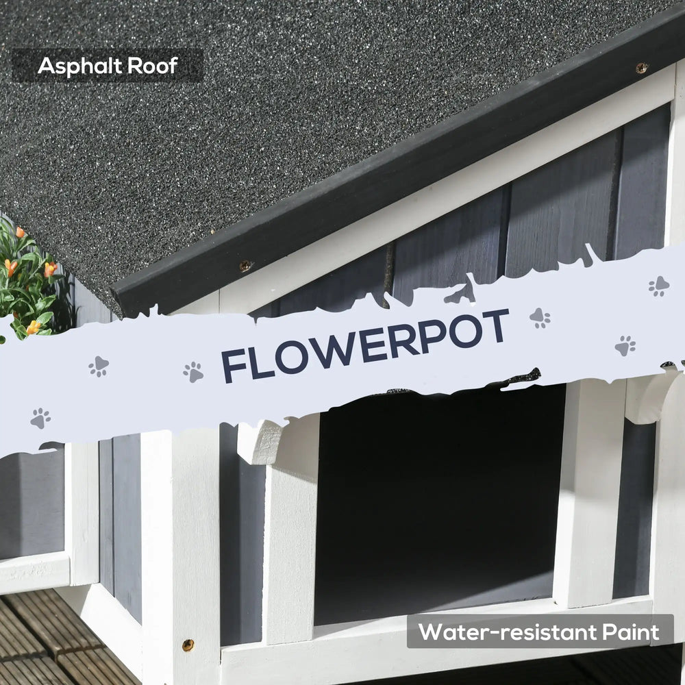 PawHut Wooden Cat House with Flower Pot, Windows, Multiple Entrances, Water-Resistant Roof for Outdoor - Grey