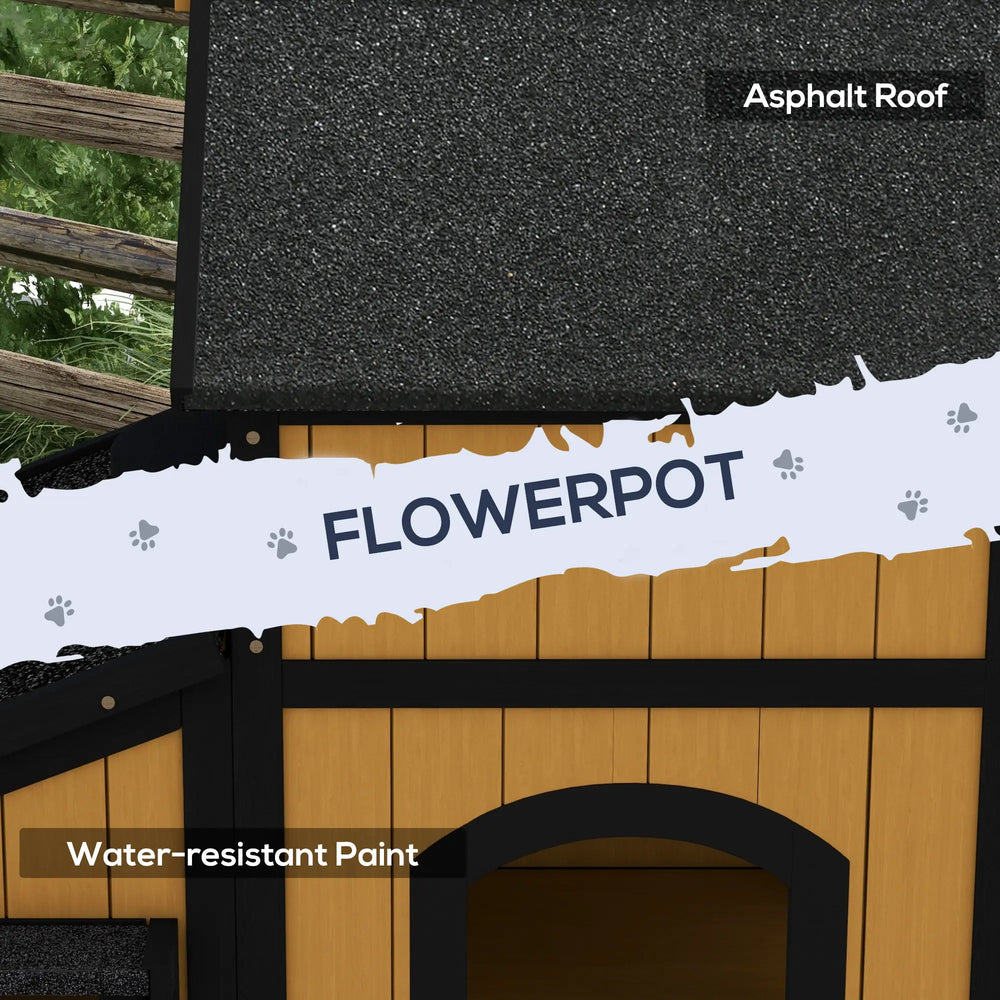 PawHut Wooden Cat House with Flower Pot, Windows, Multiple Entrances, Water-Resistant Roof for Outdoor - Yellow