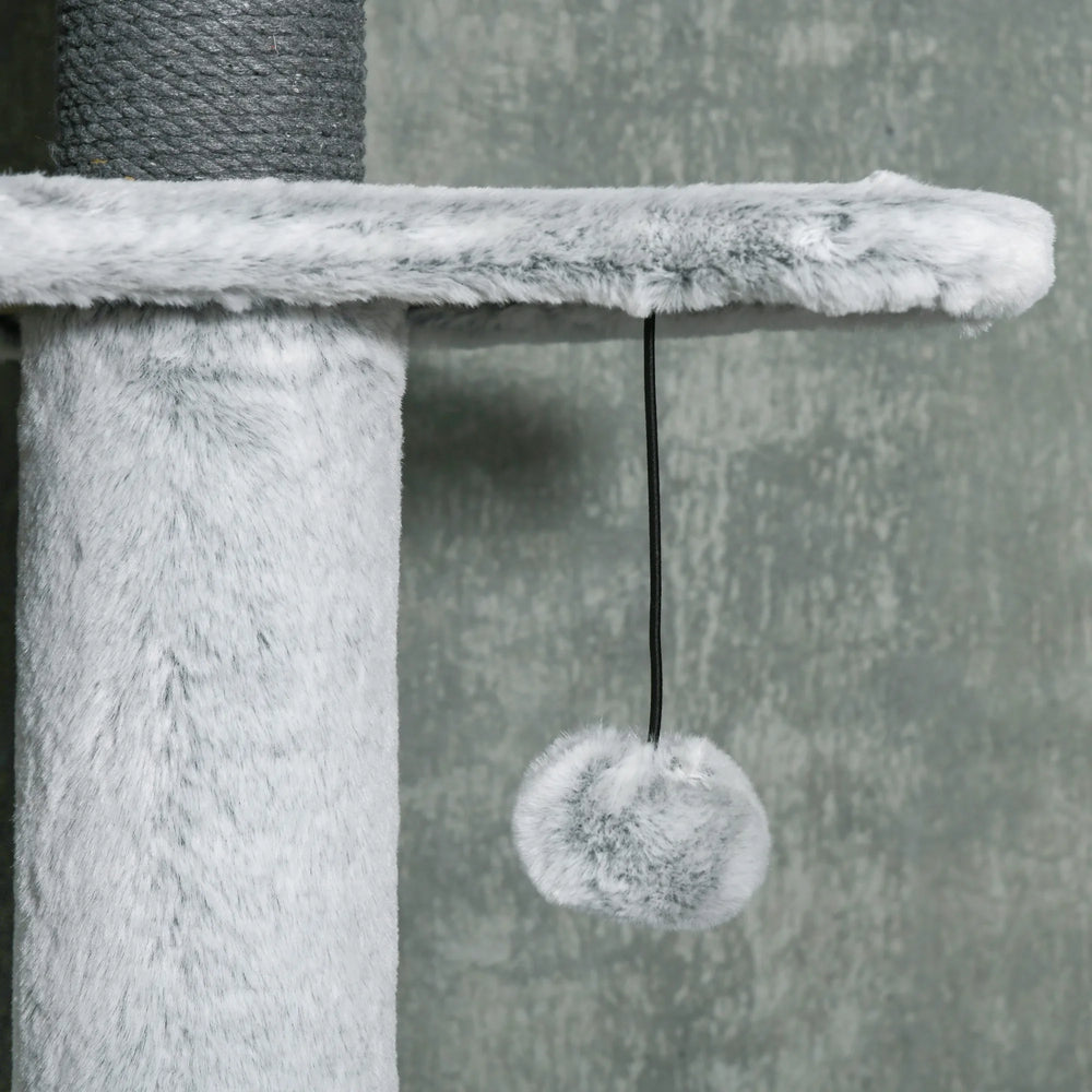 Say goodbye to ripped curtains, ruined carpets and damaged sofas and say hello to this PawHut floor-to-ceiling cat tree, designed to bring joy and adventure to pets. Multiple levels for climbing and jumping, whilst the scratching post allows them to scratch away, keeping their claws healthy. The toy ball grabs their attention, keeping them entertained. To relax, they have perches, a cat house and a hammock - all covered with velvet for added comfort. It's a haven to make each day a special one.