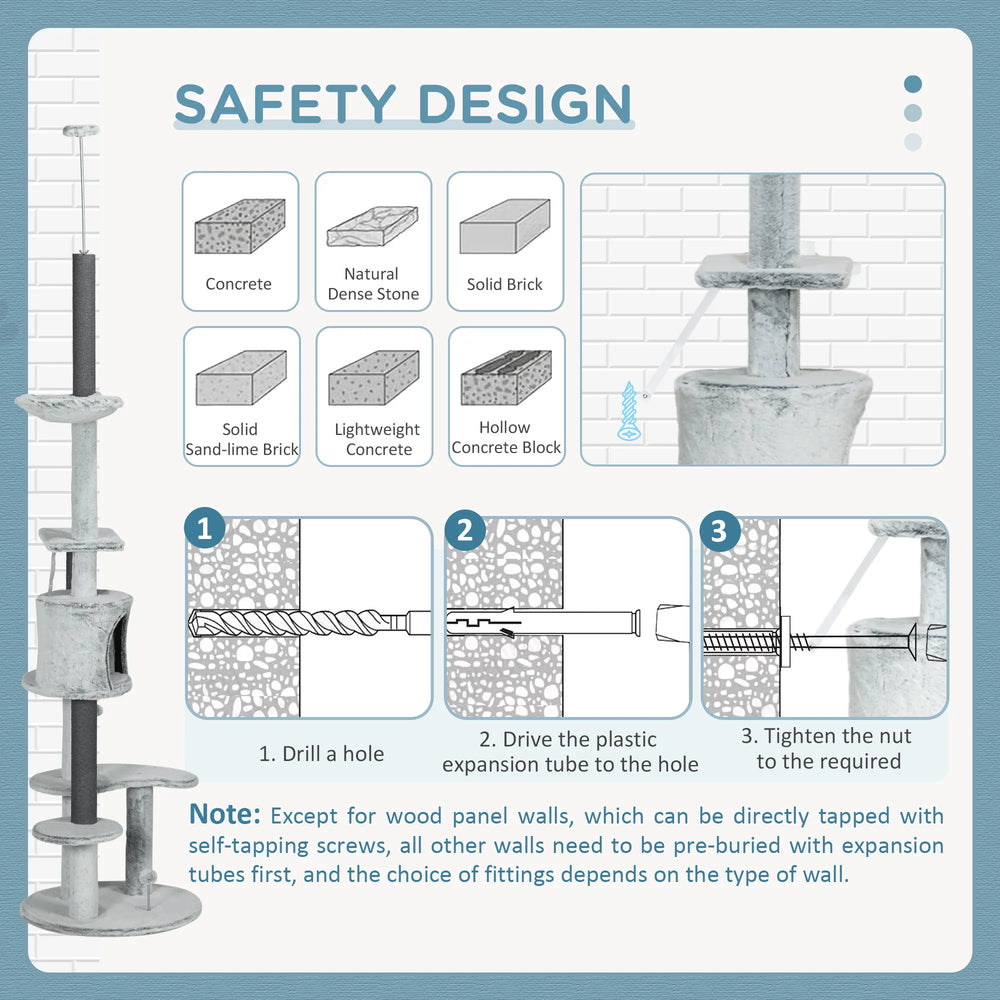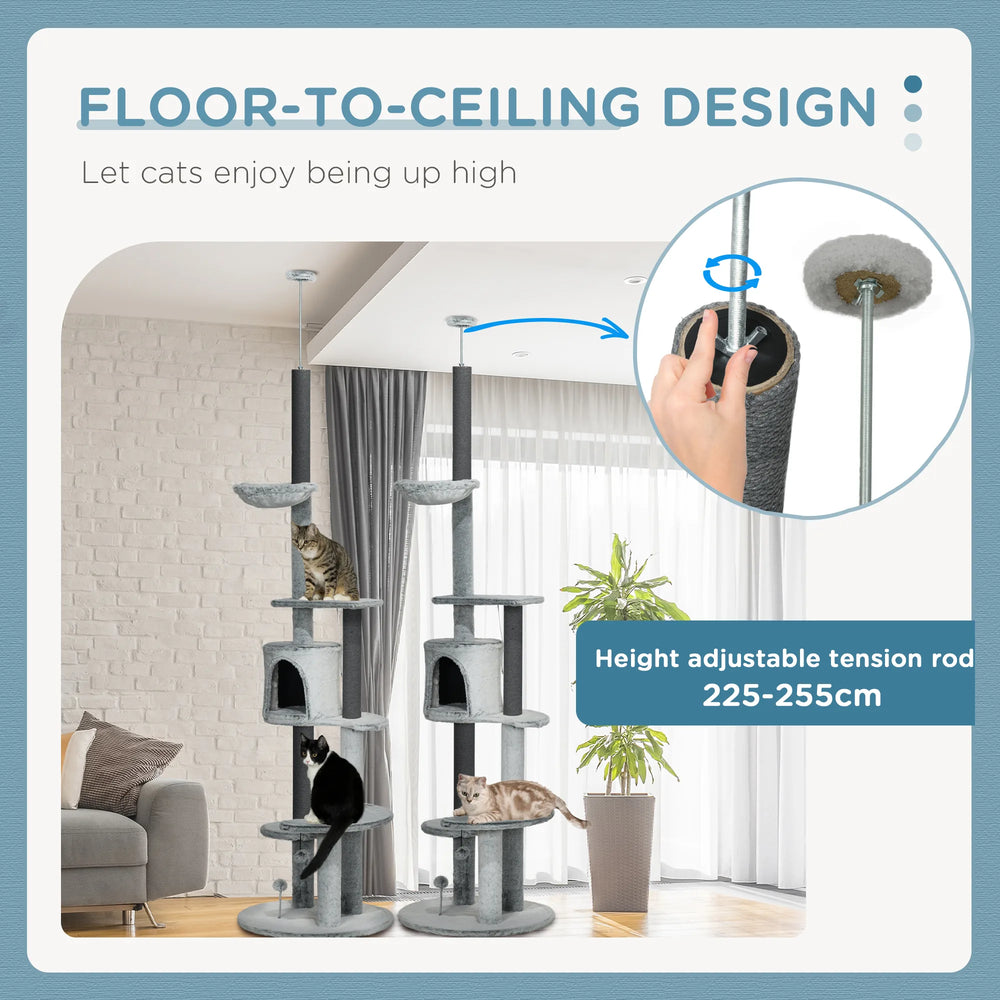 PawHut 255cm Floor to Ceiling Cat Tree with Scratching Posts, Height Adjustable Cat Tower with Hammock, House, Anti-tipping Kit, Perches, Toys, Grey