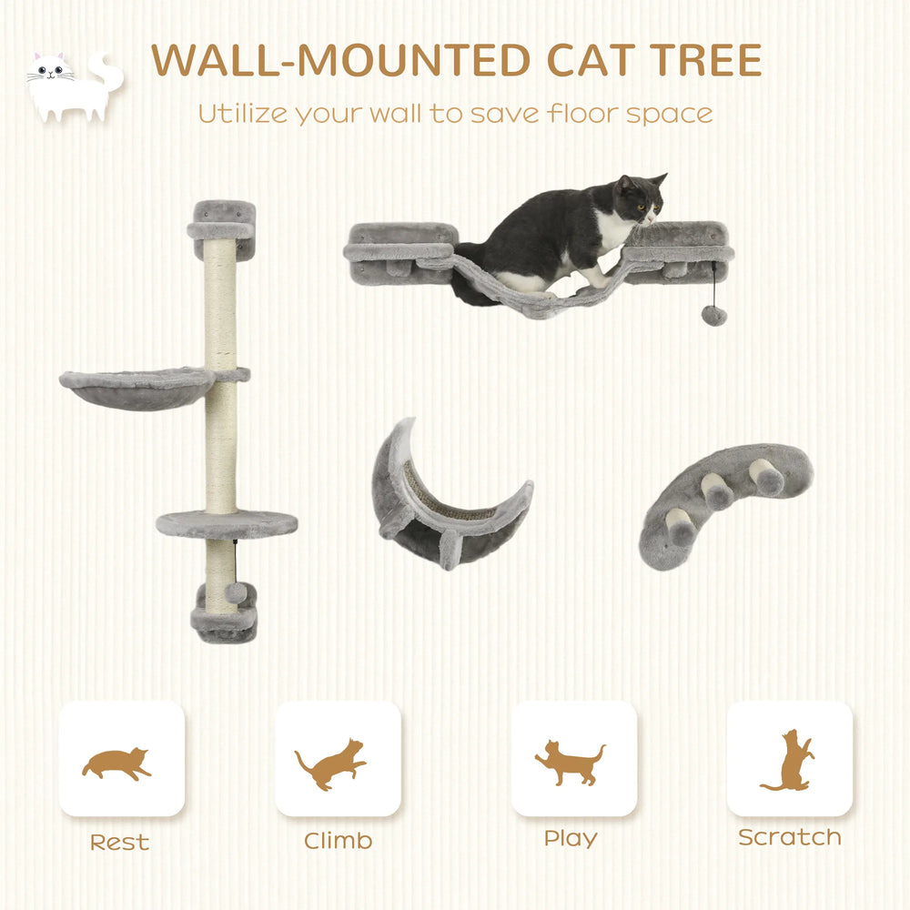 PawHut Four-Piece Cat Wall Furniture, with Hammock, Ladder, Platforms, Steps, for Indoor Use - Grey