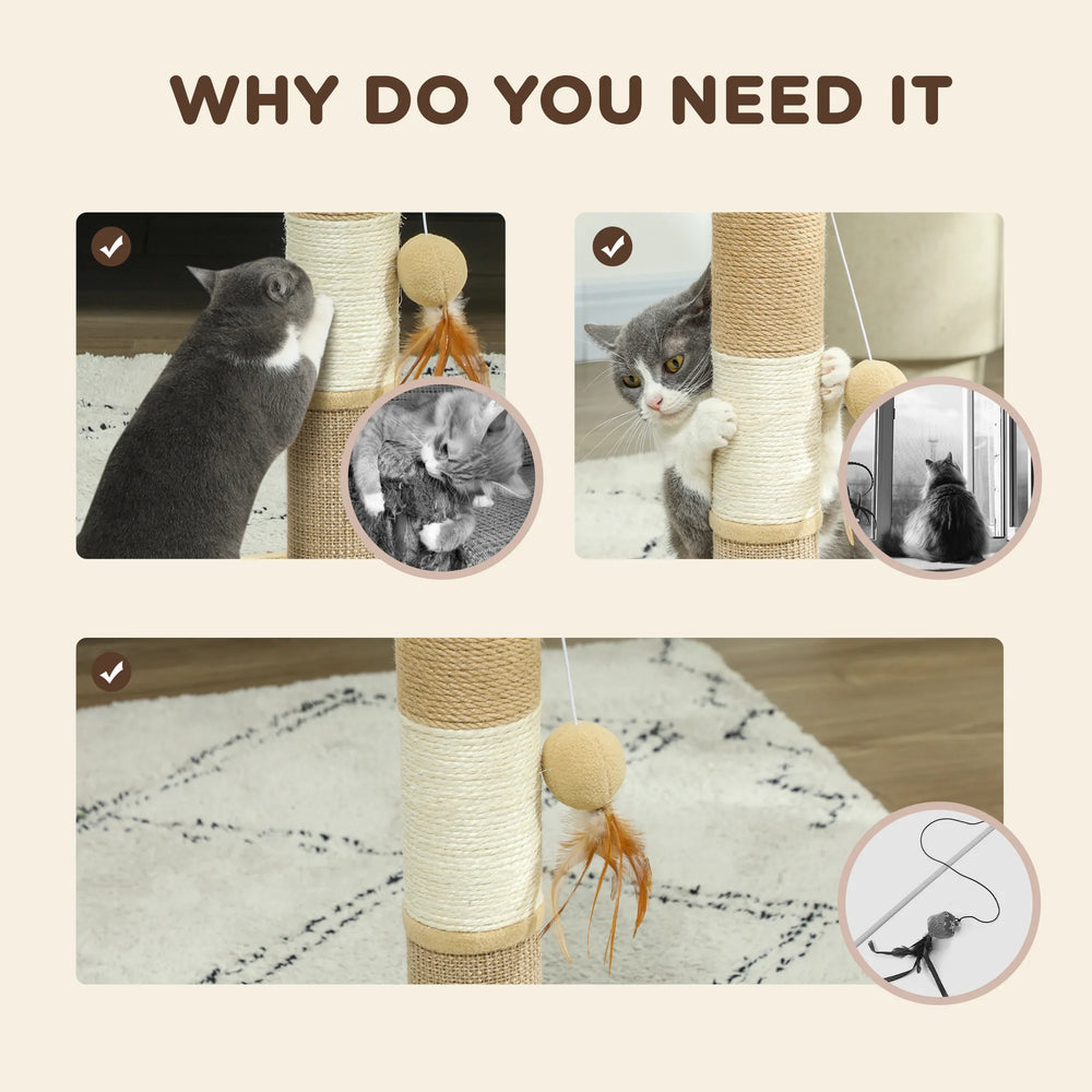 Turn any corner into a clawing haven with the PawHut scratch post. Crafted with hessian fabric, sisal and jute rope, it's great for sinking claws in, keeping them sharp and healthy plus, it stops them from using your furniture! It also includes a spring feather and toy ball, capturing their attention when playful. Its strong, round base and anti-slip flannel ensure it stays firmly in place. It's a great addition for indoor cats, allowing them to release their wild side in a safe space.