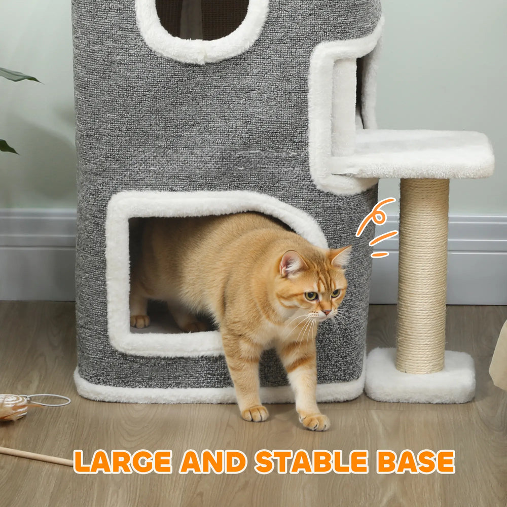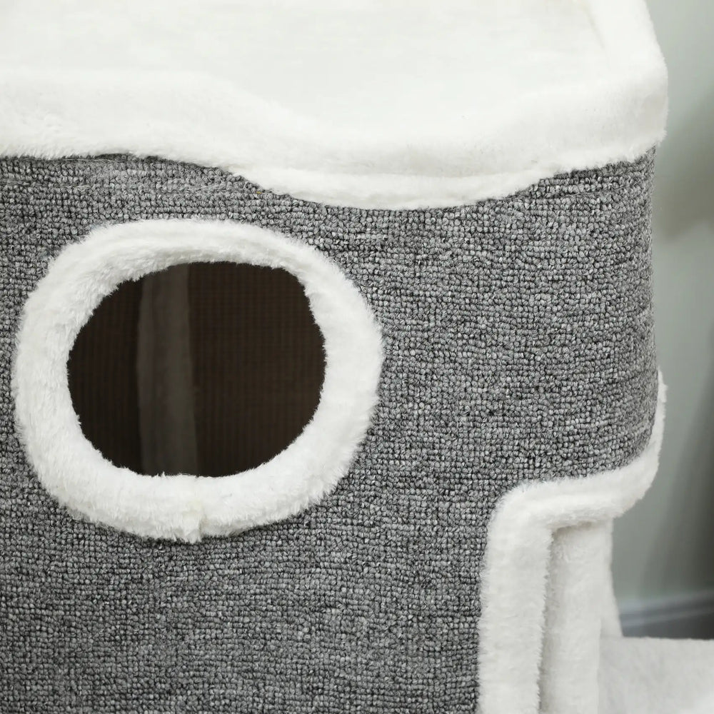 Give your cat a comfortable and joyful experience with this stylish PawHut cat house. Designed with three tiers, it includes a spacious top perch for observing, two private cat houses and a scratching post to keep them active. With plush faux fur covering, it's soft on their paws and creates a warm, inviting sanctuary. The modern carpet design with soft white trim ensures it blends seamlessly into any space, without being intrusive.