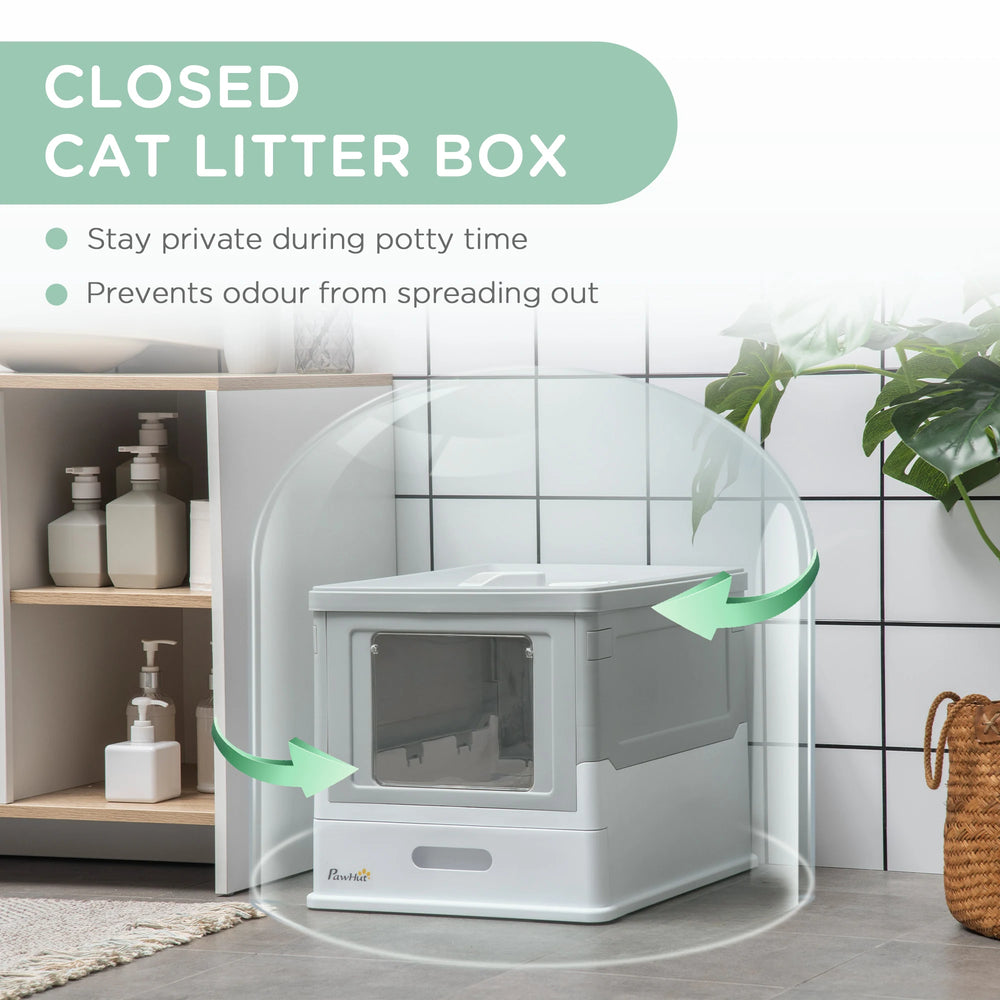 PawHut Hooded Cat Litter Box, Portable Pet Toilet, with Scoop, Front Entry - Grey