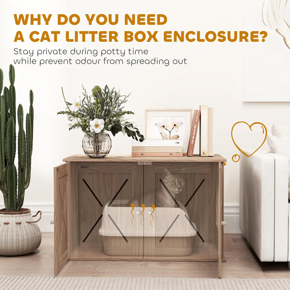 Transform your home with the PawHut Litter Box Enclosure, a sleek cat litter cupboard that doubles as a stylish table. This hidden litter box blends seamlessly into your decor while offering your feline friend a private spot. A side entrance ensures easy access and lots of ventilation keeps the area fresh. Enjoy a clutter-free space with this chic cat litter furniture!