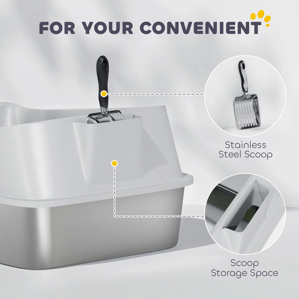 PawHut XL Stainless Steel Cat Litter Box with High Sides, Metal Scoop, 60 x 40 x 30 cm