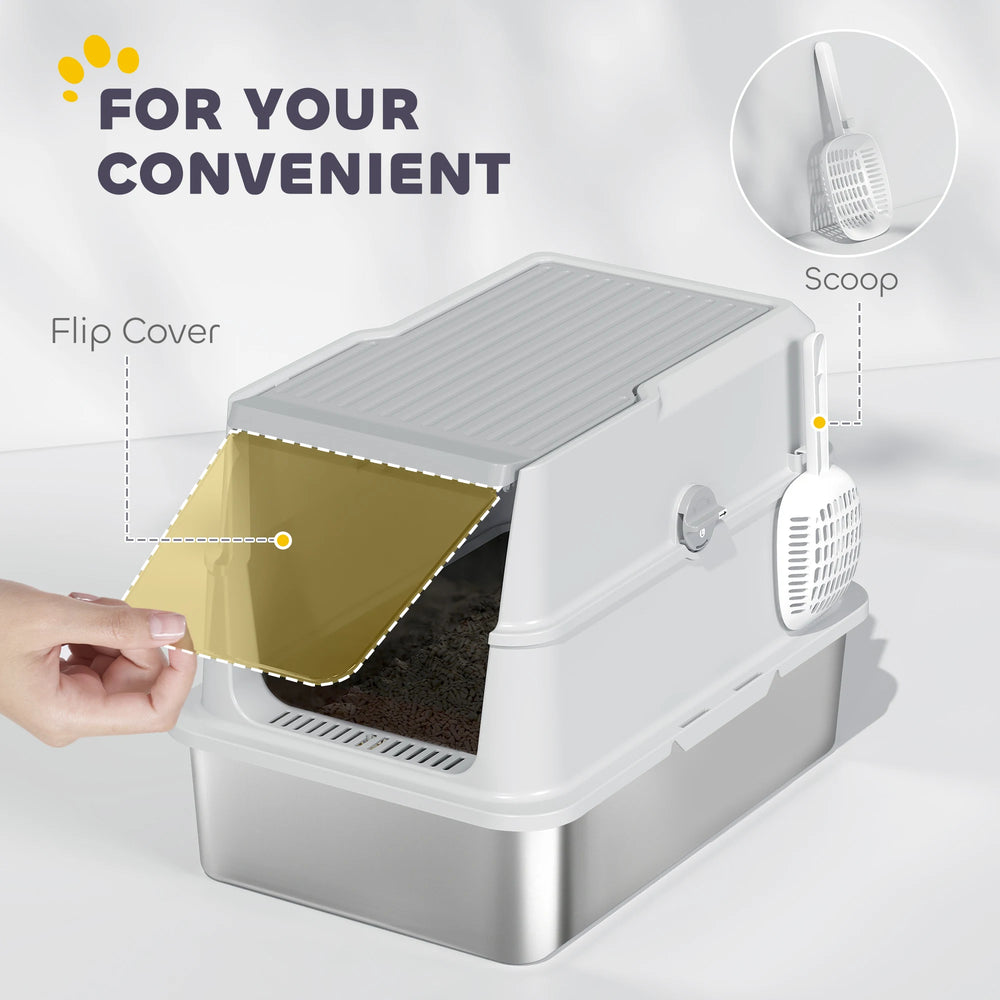 PawHut Extra Large Stainless Steel, Cat Litter Tray with Scoop, Flip Top