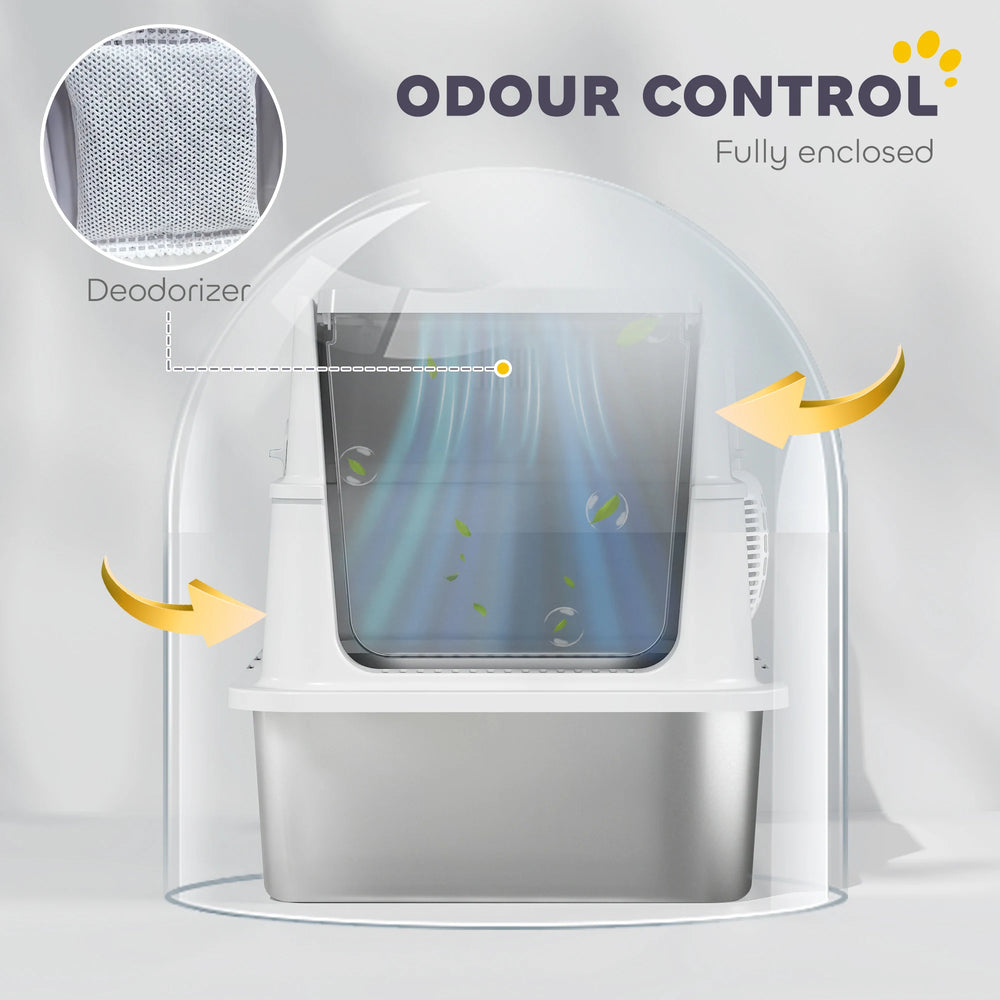 Tired of litter mess and odours? The PawHut cat litter tray features a scratch- and odour-resistant stainless steel design for easy cleaning and hygiene. Spacious enough for larger cats to move freely, its enclosed structure provides privacy and traps smells. The lift-up lid and included scoop make cleaning quick and simple. Compact and stylish, it fits perfectly into any home.
