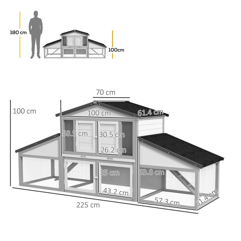 - Spacious rabbit hutch: With 225cm of space from end to end, pets have lots of distance to play, hop and run. Includes two ramps that are connected to the rabbit house, providing a private and sheltered place to relax in comfort.
