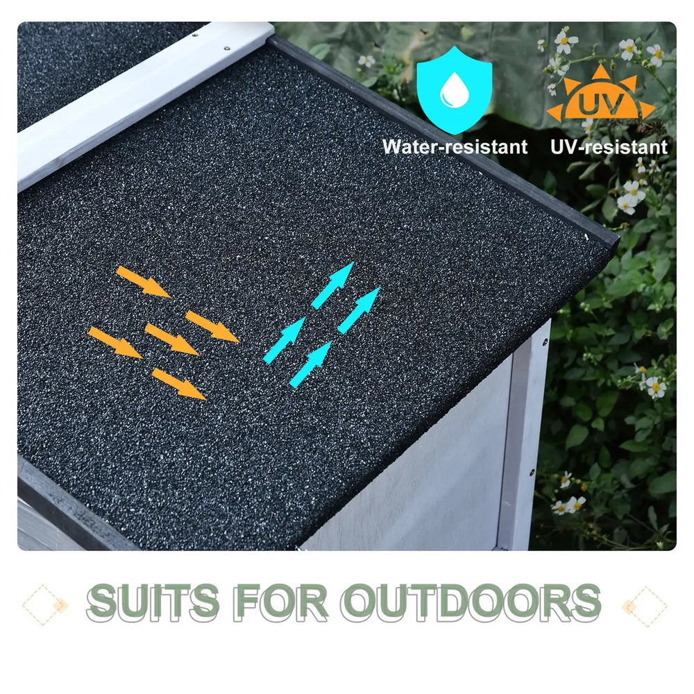 - ASHPALT ROOF: Tilted to prevent water build up damage, it helps protect your pet from UV and water. DIMENSIONS: 68H x 150L x 52.5Wcm. House: 42.5H x 71.8L x 44Wcm. Bottom room: 25.7H x 71.8L x 44Wcm.