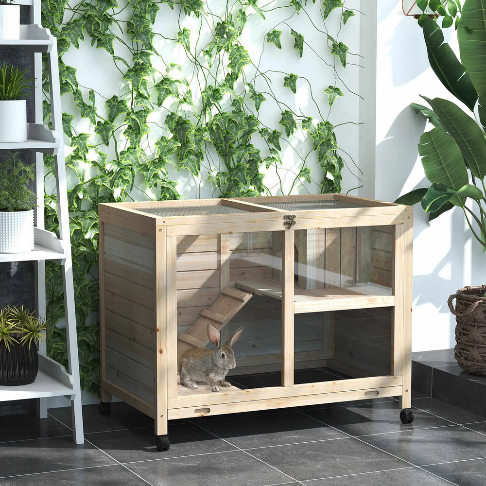 PawHut Rabbit Hutch Indoor Wooden Guinea Pig House Hamster Cage with Wheels, 2 Layers Bunny Cage with Openable Roof, 91.5 x 53.3 x 73 cm, Natural