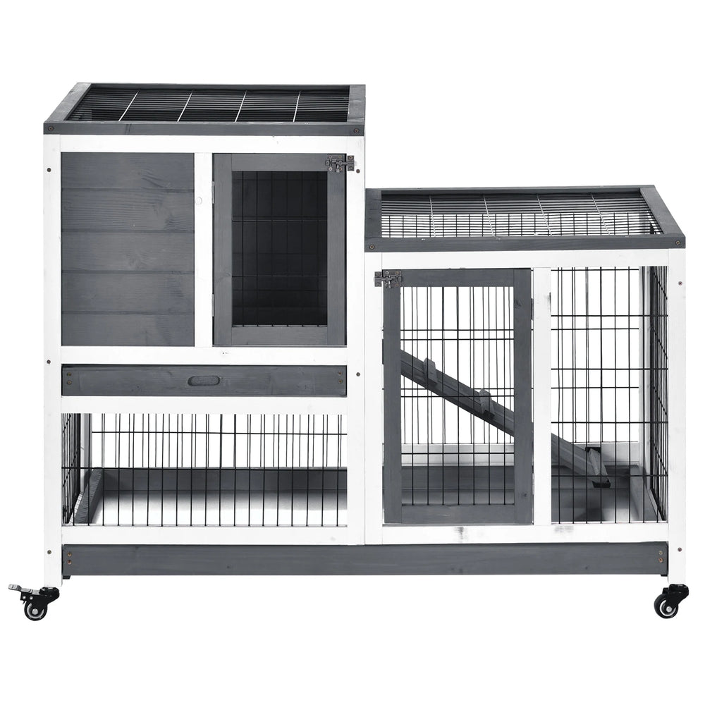 PawHut Wooden Indoor Rabbit Hutch Guinea Pig House Bunny Small Animal Cage W/ Wheels Enclosed Run 110 x 50 x 88 cm, Grey