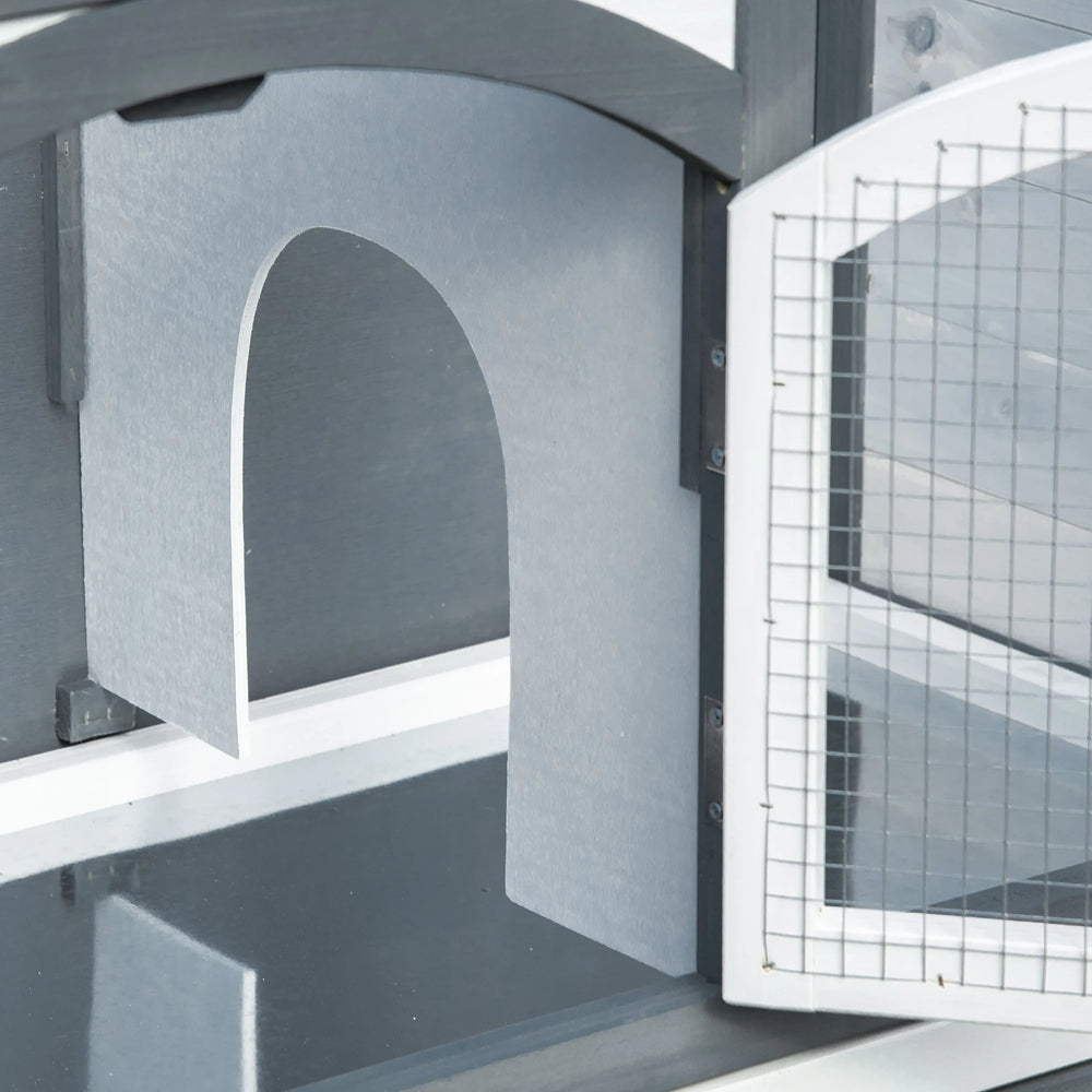 - WOODEN STRUCTURE: A solid and durable formation that is covered in water-resistant paint. Asphalt roof shelters of this outdoor rabbit hutch pets from UV and rain suitable for outdoors.