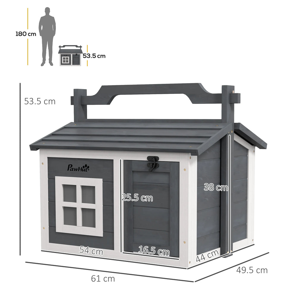 - Dimensions: With handle: 53.5H x 61L x 49.5Wcm. Overall floor area: 0.22m2. Main house: 38H x 54W x 44Dcm. Window: 15.5H x 15.5Wcm. Middle entrance: 20H x 17W