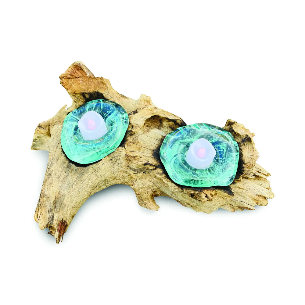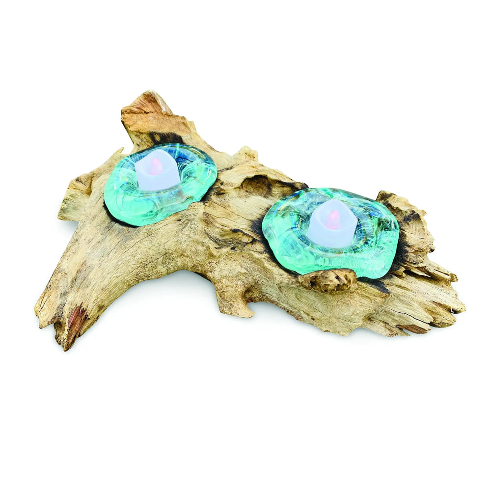 Important: the wooden base is flammable. The manufacturer recommends using battery-operated LED candles rather than open flames. Always ensure glass holders and the wood base are cool and completely dry before returning the glass to the root to avoid trapping moisture.