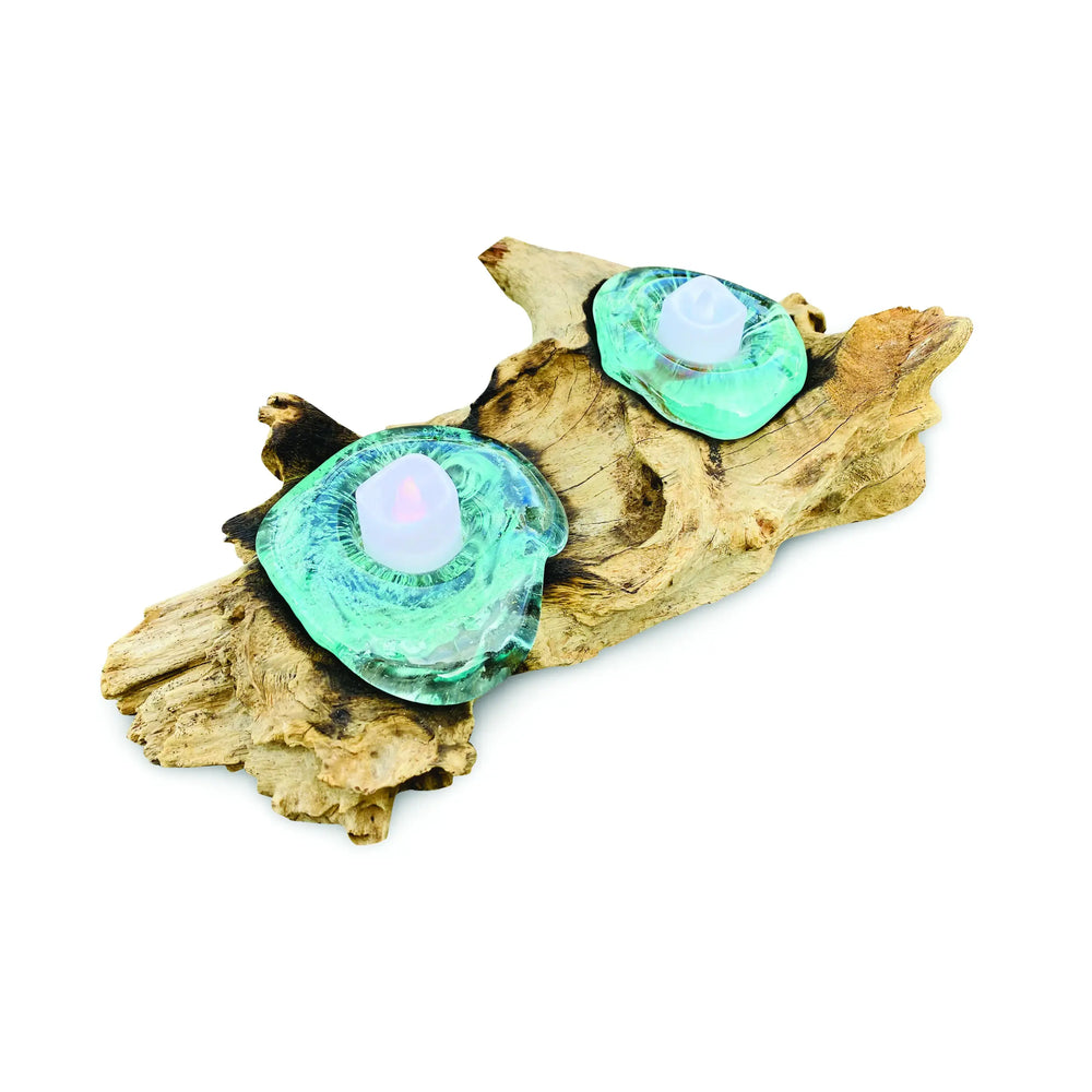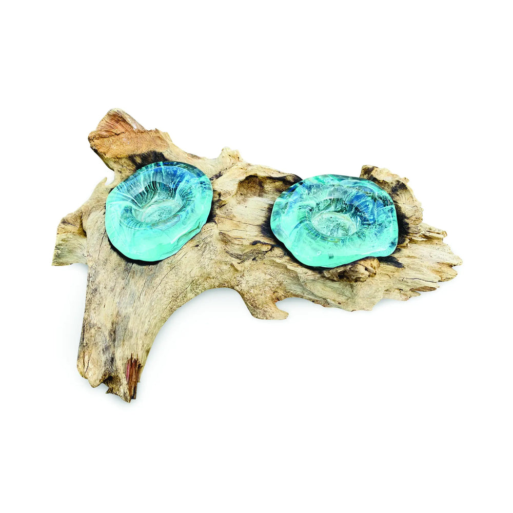 Introduce a piece of functional art to your home with this double glass candle holder mounted on a selected teak root base. Each glass holder is hand-blown and moulded onto individually chosen root pieces, creating a Dali-style melted-glass effect that makes every item unique.